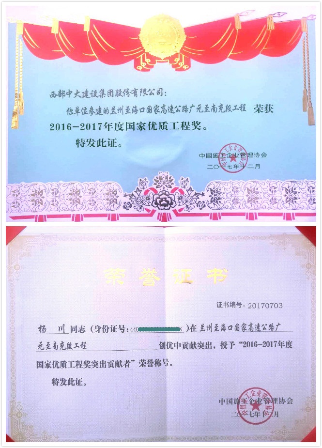 A few days ago, National High Quality Engineering Work of 2016 to 2017 Commendation Conference was held in Beijing People's Hall. High quality engineering works were commended. Huabang project, Guangyuan to Nanchong, GN 12 sector, part of Lanzhou to Haikou national expressway was shining on the list among others. This is second national prize that Huabang won after Tianfu Cup from Sichuan province for the same project. At same time, President Yang Chuan, project manager then got the title: Outstanding Talent of National High Quality Project Prize.