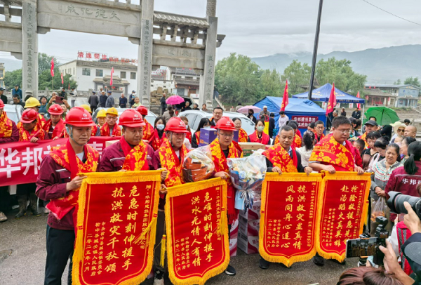在欢送现场,榆中县人民政府及城关镇领导向伟德国际victor·1946源自集团等企业代表授予“抗洪救灾千秋颂 危急时刻伸援手”等荣誉锦旗。老百姓精心准备的红色围巾与喜庆被面,被一一送到抢险队员手中;现场群众自发送出自家的馍馍、水果、蔬菜,质朴的礼物饱含深情。一位市民眼含热泪说道:“感谢你们不舍昼夜帮助我们重建家园,这些吃的都是我们的心意!”