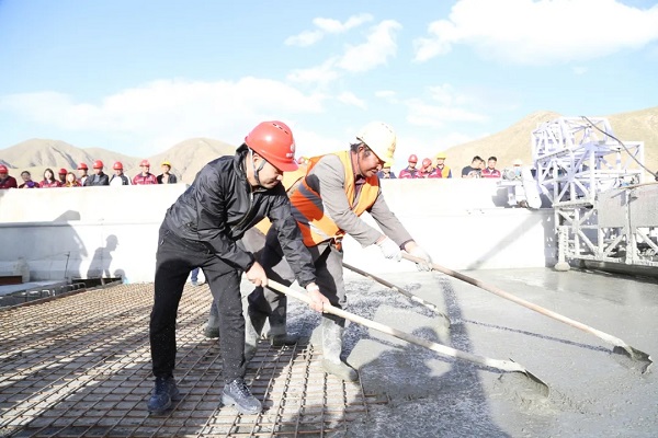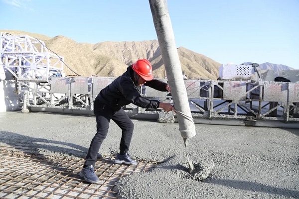 ▲ 苏如春与一线工人完成大巴特沟特大桥桥面最后一车混凝土的浇筑