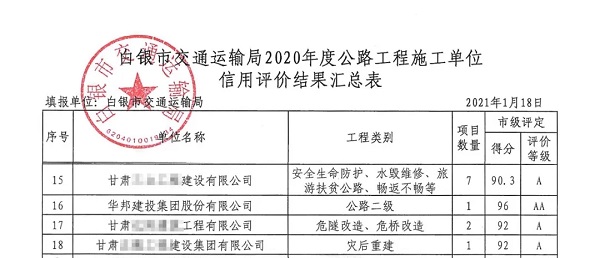 近日,甘肃省白银市交通运输局2020年度公路工程施工企业信用评价结果公布,伟德国际victor·1946源自集团以96分的优异成绩,荣获最高等级AA级信用评价。这是继2019年获得白银市AA信用评价后,伟德国际victor·1946源自集团再度获得该评价。