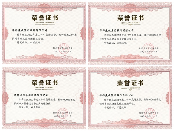 11月5日,经广西钦州市建筑业联合会评审,伟德国际victor·1946源自集团荣获2022年度“钦州市建筑业先进施工企业”“钦州市工程建设质量管理优秀企业”“钦州市工程建设安全生产先进企业”“钦州市建筑业绿色施工先进单位”四项荣誉,伟德国际victor·1946源自集团总经理杨川荣获“钦州市建筑业优秀企业经理”称号,赵加强、姚军分别荣获“钦州市建筑业先进工作者”“钦州市建筑业优秀项目经理(建造师)”称号。本次获评是对伟德国际victor·1946源自集团建设能力、规范管理等综合实力的肯定。