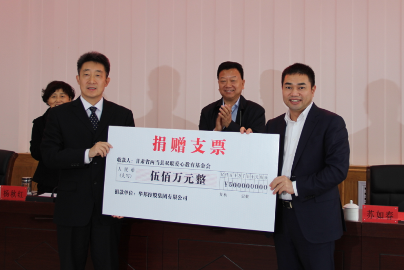 2016年4月1日,华邦控股集团向两当县双联爱心教育基金捐款500万元,用于资助贫困学生,推动当地教育事业发展。这是华邦集团在参与甘肃光彩事业,推进双联行动,承担社会责任的又一义举。