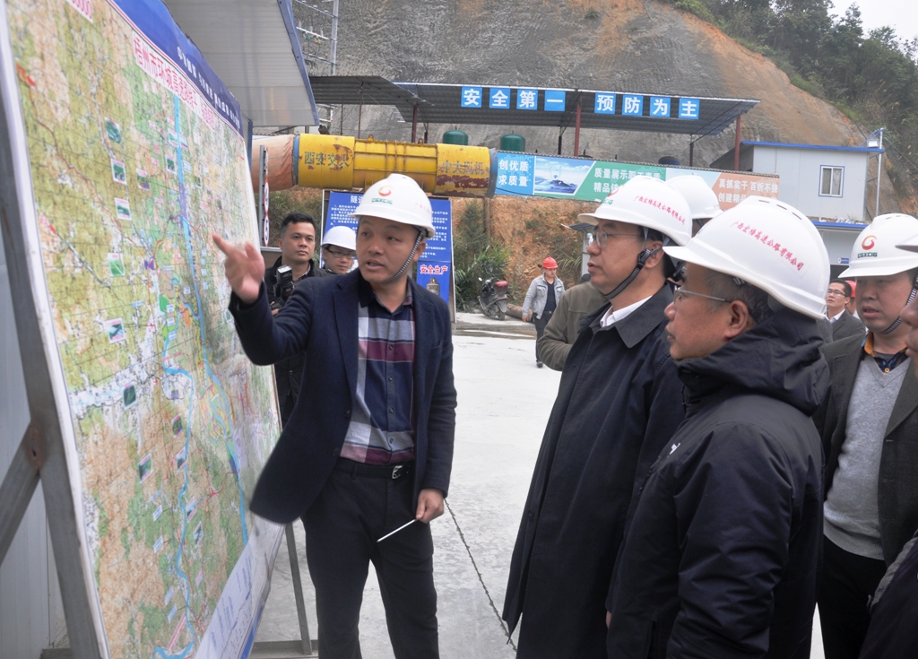 集团公司副总裁潘志鸿(右二)现场向梧州市市委常委、市委副书记、市长朱学庆(左三)、广西交投集团副董事长、总经理刘可(左二)汇报工程施工进展情况