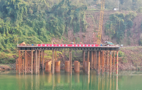 金沙涪江特大桥是主跨220米的连续刚构桥梁,是本项目施工难度最大、技术要求最高的控制性节点,目前桥梁主墩桩基40根全部完成,引桥桩基完成25根,2号主墩钢栈桥及钢平台施工完成,正在进行2号主墩锁扣钢管桩围堰、3号主墩钢栈桥及钢板桩围堰施工。