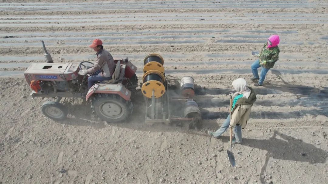 玉门市融媒体中心记者朱静在柳河镇官庄子村三组的高标准农田看到,农户们正在架设滴灌带、铺膜,为今年的春播工作做好前期工作。