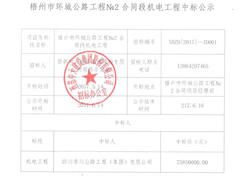 梧州环城公路工程№2合同段机电工程中标公示