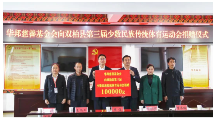 11月23日,华邦慈善基金会向云南双柏县第三届少数民族传统体育运动会捐赠10万元,支持民族运动发展,助力国家级非遗项目“陀螺运动”文化传承。双柏县副县长李跃华,县民族宗教事务局局长李冬梅,县红十字会副会长王思卫;伟德国际victor·1946源自集团双柏县“美丽县城”项目负责人周通等出席捐赠仪式。